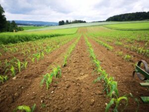 Polenta-Mais auf dem Feld: Beachte die strubbeligen Maisblüten der verschiedenen Sorten und die Begleitkräuter!