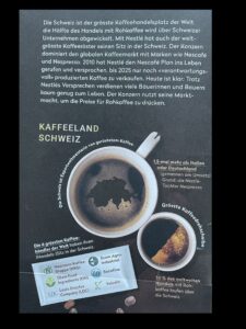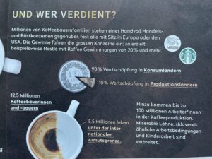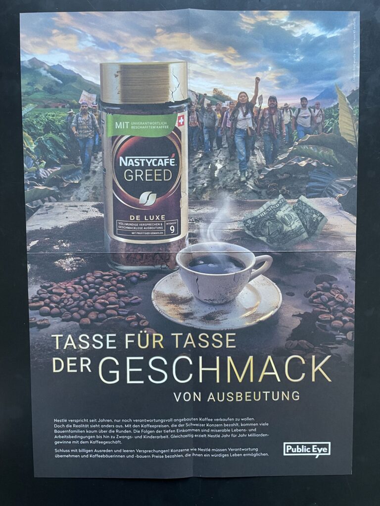 Pro Jahr trinkt jeder Mensch in der Schweiz durchschnittlich über 1000 Tassen Kaffee, also drei bis vier Tassen pro Tag. Aber wenigen ist bewusst, dass Kaffee auch seine Schattenseiten hat: Für viele Kaffeebauern im Süden reicht das für ihren Kaffee erhaltene Geld nicht zum Leben aus. Dies zeigen Recherchen von Public Eye. Die Bilder stammen von einem Poster zu diesem Thema.